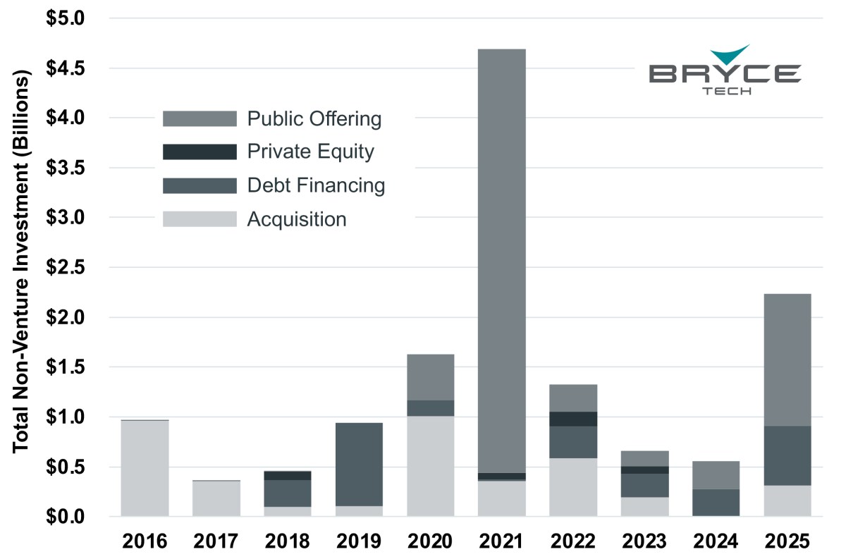 “The increase in non-venture funding in 2025 appears to be a sign of industry maturing,” Franklin said, “though there were other prevailing positive conditions for going public, such as high investor sentiment in defense tech.”